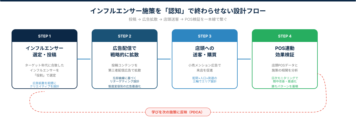 認知から購買までを一本の線で繋ぐには、インフルエンサー投稿を「完成品」ではなく「素材」として捉え、広告配信による拡散、店頭への送客、POSデータによる効果検証までを一気通貫で設計する必要があります。